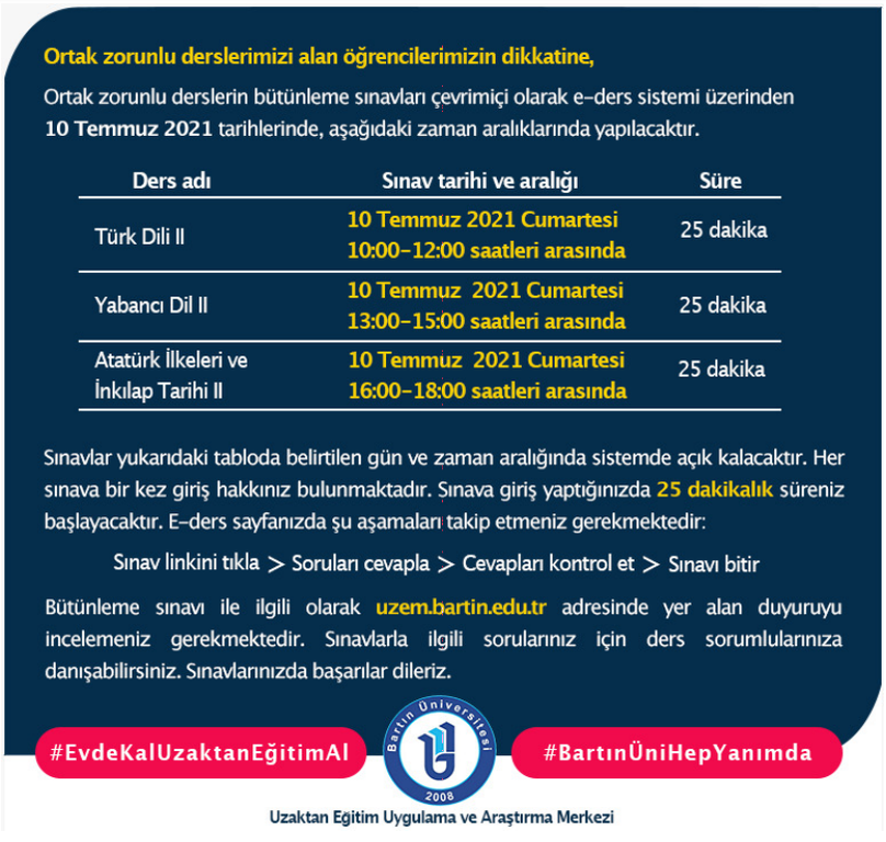 Not: Ortak zorunlu derslerden(Türk Dili II,Yabancı Dil II,Atatürk İlkeleri ve İnkılap Tarihi II) geçtiğiniz halde bütünleme sınavına girmek için(not yükseltmek) 6 Temmuz 2021 Salı günü mesai bitimine kadar bmyo@bartin.edutr e-posta adresine gönderecekleri  dilekçe  (Ek-1  FRM-0095  Not Yükseltme Amacıyla Bütünleme Sınavına Girme Talep Formu) ile gerçekleştirilecektir.