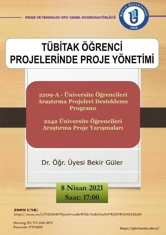 Üniversitemiz öğrencileri arasında araştırma ve proje kültürünün yaygınlaştırılması amacıyla Proje ve Teknoloji Ofisi Genel Koordinatörlüğü tarafından belirli dönemlerde etkinlikler gerçekleştirilmektedir. Bu kapsamda Eğitim Fakültesi öğretim elemanı Dr. Öğr. Üyesi Bekir GÜLER tarafından; TÜBİTAK’ın Üniversite öğrencilerine yönelik destek programları çerçevesinde düzenlemiş olduğu, “2242 Üniversite Öğrencileri Araştırma Proje Yarışmaları” ve  genel olarak yılda iki kez ilana çıkılan “2209-A Üniversite Öğrencileri Araştırma Projeleri Destekleme Programı” hakkında 8 Nisan 2021 Perşembe günü saat 17:00’de zoom programı üzerinden online olarak “TÜBİTAK Öğrenci Projelerinde Proje Yönetimi” etkinliği düzenlenecektir. Söz konusu yarışma ve destekleme programı hakkında verilecek olan eğitime Üniversitemizin tüm öğrencileri davetlidir.