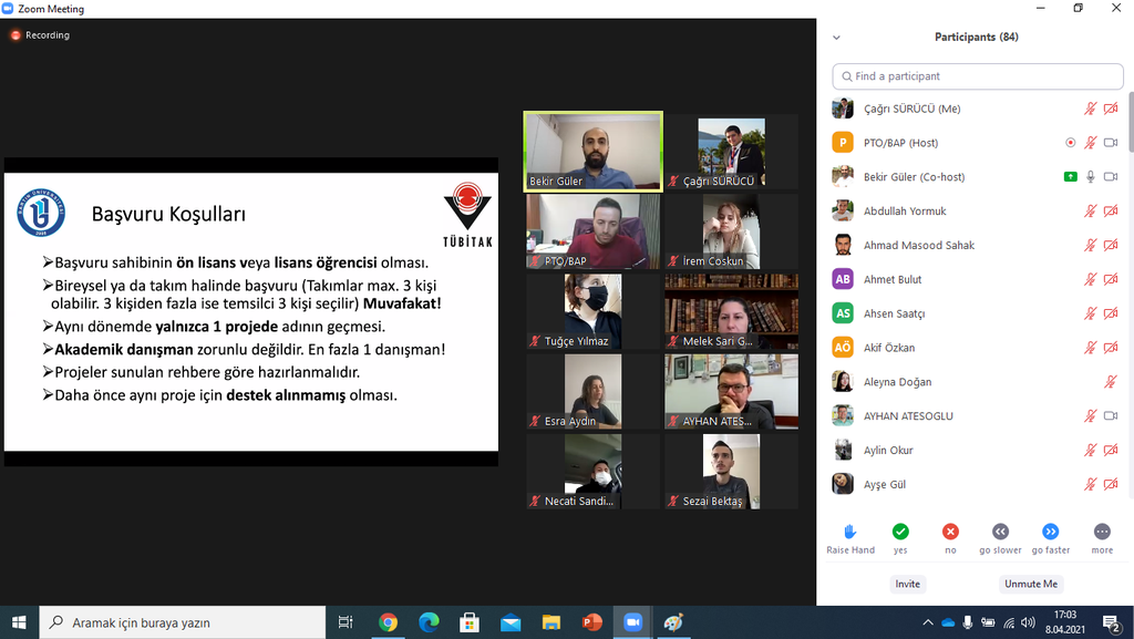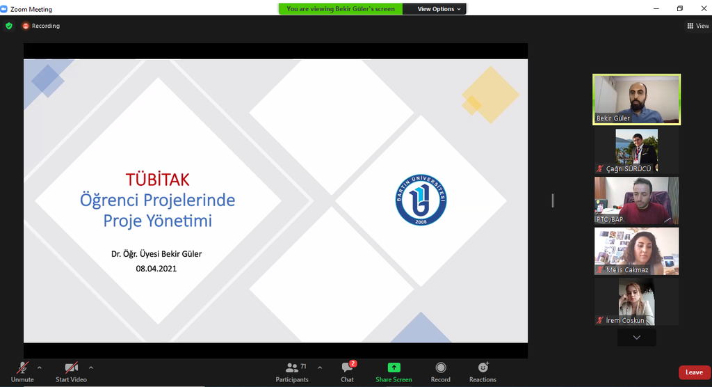 Akademik danışmanlık eylem planı çerçevesinde 1. sınıf ve 2. Sınıf öğrencileri 8 Nisan 2021 tarihinde saat 17:00'da  Proje ve Teknoloji Ofisi Genel Koordinatörlüğü tarafından  “TÜBİTAK Öğrenci Projelerinde Proje Yönetimi” konulu etkinliğe katıldı. Ayrıca öğrencilerimeze danışman hocaları bölüm başkanı Öğr. Gör.  Çağrı SÜRÜCÜ ve Öğr. Gör. Dr. Gökhan Emir tarafından ''ulusal ve uluslararası öğrenci projeleri'' konusunda bilgilendirme yapılmıştır.