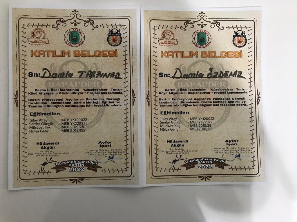 Bölümümüz öğrencilerinden Damla TAŞPINAR ve Damla ÖZDEMİR, Bartın İl Özel İdaresinin " Güzelcehisar Turizm Köyü Altyapısını Güçlendiriyor" projesi kapsamında Bartın Profesyonel Aşçılar ve Pastacılar Derneği tarafından düzenlenen Bartın Mutfağı ve Tanıtım etkinliğine katılmıştır. Etkinlikte Bartın Mutfağının yöresel ürünleri hazırlanılarak tanıtımı yapılmıştır. Ayrıca bölümümüz öğretim elemanları Öğr. Gör. Dr. Gökhan EMİR ve Öğr. Gör. Çağrı SÜRÜCÜ Tüm Aşçılar ve Pastacılar Konfederasyonu As Başkanı Hüdaverdi AKGÜN ile birlikte Güzelcehisar Gastronomi Merkezini ziyaret etmişlerdir.